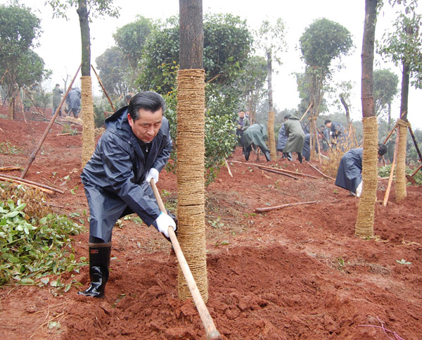 我们的市委书记把树坑填平、将围堰培实,每道工序都那么一丝不苟。“因为坡度较高,所以要从上往下推土,才能填平树坑,避免水土流失。”戴道晋手握铁锄,一边培土,一边与一同植树的同志交流起了植树的要领。他说培土有规律可循,造林也有规律可循,希望大家行动起来,抓住眼下正是植树造林的大好时节,一起共建绿色家园。
