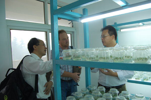 根据省林业厅科技推广总站安排,2011年10月12日上午,澳大利亚墨尔本大学桉树专家Chris Weston 博士访问南岭植物园,开展桉树栽培方面的学术交流活动,Chris Weston 博士与我园桉树科研人员就桉树育种选择、营造林技术、病虫害防控方面进行了交流。桉树主产大洋洲,属桃金娘科(Myrtaceae),桉属(Eucalypteae),湖南曾先后引入10余种。目前,我园开展引种试验的桉树主要有邓恩桉(EuCahetus dunnii Maiden)、赤桉(E.camaldulensis)、柳叶桉(E.saligna)、边沁桉(E.benthamii)。