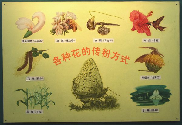 植物的异花传粉需借助外力才能完成,传送花粉的媒介有风、昆虫、鸟甚至水。最为普遍的是风和昆虫。以风力传送花粉的方式称为风媒。大部分禾本科都是风媒植物,如杨树、栎树、桦木及等。它们的花叫风媒花。风媒花的花被不显著,没有鲜艳的颜色,也没有香气和蜜腺,不能引来昆虫帮忙,但是它们的花粉干燥、轻小、量多,便于被风吹送,更多地保证了传粉的机会。禾本科植物的雄蕊的花丝比较长,花药悬垂在花外,可随风传播。这些摆动的花序和花药都是风媒植物对风媒传粉的一种适应。风媒花的雌蕊为增加接受花粉的机会,它的柱头扩展非常显著突出。 借助昆虫传送花粉的方式叫虫媒,靠昆虫传粉的花叫虫媒花。虫媒花一般具有鲜艳的花被,芳香的气味和蜜汁。虫媒花的花粉体积较大,表面粗糙,利于昆虫携带,如木槿、牡丹、桃花等。