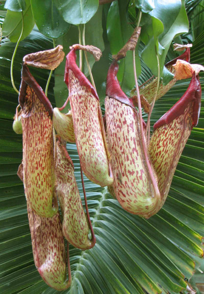 在我国的云南、广东等南方各省,你可以见到一种绿色小灌木,它的每一片叶子尖上,都挂着一个长长的“小瓶子”(实为变态的叶),上面还有个小盖子,盖子通常情况下是半开着的。这“小瓶子”的形状很像南方人运猪用的笼子,所以人们给这种灌木取了个名字,叫“猪笼草”。奇妙的就是它的这个“小瓶子”。猪笼草的“瓶子”内壁能分泌出又香又甜的蜜汁,贪吃的小昆虫闻到甜味就会爬过去吃蜜。也许就在它吃得正得意的时候,脚下突然一滑,一头栽到了“小瓶子”底上,瓶子上面的盖自动关上了,而且瓶子里又贮有粘液,昆虫很快被粘液粘得牢牢的,想跑是跑不掉了。于是,猪笼草便得到了一顿“美餐”。猪用的笼子,所以人们给这种灌木取了个名字,叫“猪笼草”。