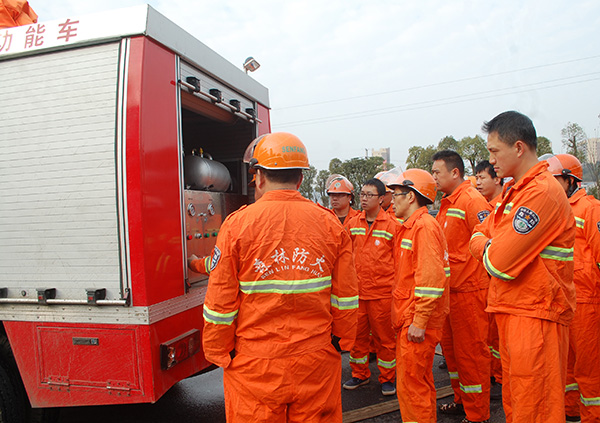本次演练主要任务是要求应急分队成员都能熟练操控新配发的SXFD1500-500B型多功能森林消防车。首先消防车管理员给大家详细讲解了消防车的使用方法及各种注意事项。然后应急分队成员三人一组进行了实际操作:一人启动设备,另外两个人,接装消防水管、水枪,并把持水枪,对假想火灾场景进行喷水灭火操作。由于对新设备不熟悉,刚开始的时候,遇到不少问题,如设备不能正常启动或运转不正常,设备送出的水压过大,大家一时不能很好的掌握水枪灭火的要领。最终,在何才生所长的带领下,大家经过多次反复演练,最终都能熟练操控新设备,确保了一旦出现险情,应急分队人员能够第一时间迅速赶到事发地点进行险情处置。