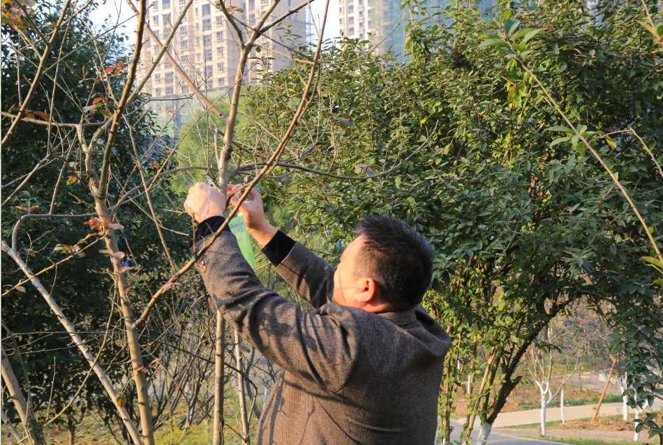 12月21日,阳光明媚,南岭植物园海棠专类园内一片热闹景象。郴州市林科所党支部组织全所党员在开展树木认建认养活动,以此推动“党员示范林”活动的开展。