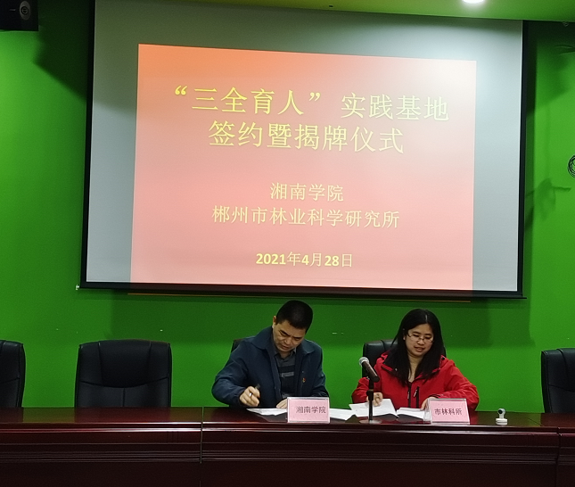 2021年4月28日,市林科所与湘南学院基础医学院正式签约携手共建“三全育人”实践基地,湘南学院基础医学院党总支书记、教授蒙艳斌,副书记邓道永,市林科所党支部副书记、副所长曾召华,副所长李茂娟等人员出席签约暨揭牌仪式。