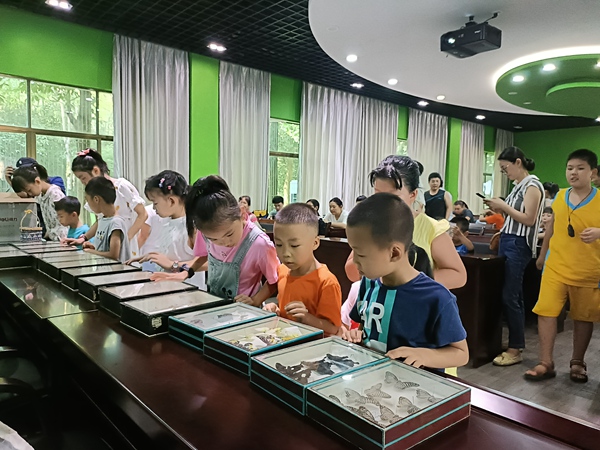 活动中,植物园科普老师领着孩子们亲密接触自然,沿途普及水杉、银杏等古老树种的进化与繁衍故事,近距离观察板栗、柿子、海棠的果实,赏闻月季、蓝花草、彼岸花、夏堇等花儿的美丽芬芳,动手轻挠紫薇的树干体验它的怕痒反应,寻找花叶间的小昆虫,抓捕空中翩翩飞舞的美丽蝴蝶和蜻蜓。孩子们在玩乐中便将大量的动植物知识装进了大脑。
