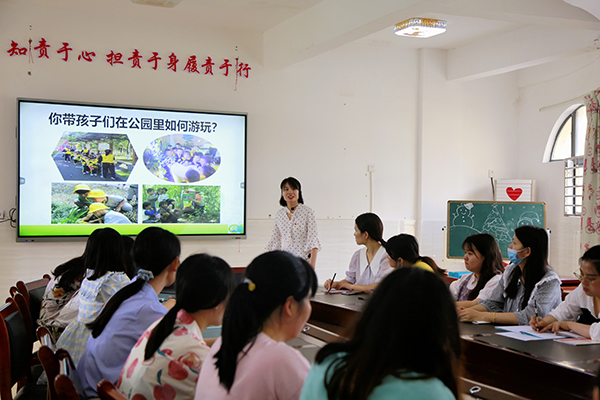 4月27日,南岭植物园科普人员走进北湖区第二幼儿园开展《自然教育导师公益培训班》讲座,植物园科普老师从自然教育概念、课程设计、课程实践和成效四个方面跟幼儿园全休幼师进行了幼儿自然教育实践探讨。强调了“视觉、听觉、嗅觉、触觉、味觉”五感体验在自然教育中的重要性。在早期教育阶段,打开幼儿的“五感”,全方位接触自然,可以更好地促进孩子的生理、语言、智力等方面的发育。最后,科普讲解老师与幼教老师共同探讨了如何用更多地游戏激发幼儿对自然的热爱,同时促进幼儿的性格塑造和技能提升。