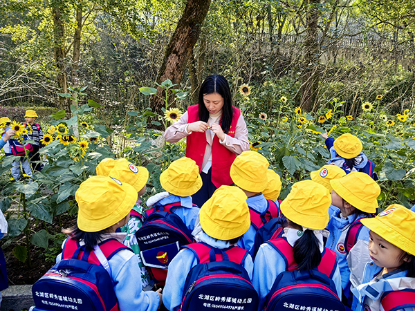 向日葵,被誉为“向往光明之花”,是一种向光性极强的一年生草本植物,它不仅具有独特的生物学特性,还具有重要的生态价值。每年秋天,南岭植物园时令花展区成片的向日葵都能吸引众多游客前来观赏。南岭植物园科普团队根据不同受众年龄,设计了3套不同深度的向日葵为主题课程。其中幼儿阶段课程以绘本形式介绍了向日葵的生命周期,并以向日葵花实物调动幼儿的五感,以满足幼儿的好奇心,激发幼儿对大自然的探索欲;小学、初中版则基于他们所学的语文、数学、生物、科学、历史、美术等课程,以学科视角揭秘向日葵,同时结合自然观察笔记和向日葵科学拆解等环节,让学生学会多角度欣赏身边自然之美,以科学视觉去探究身边自然物蕴含的生存智慧和奥秘,促进学生科学素养的提升。